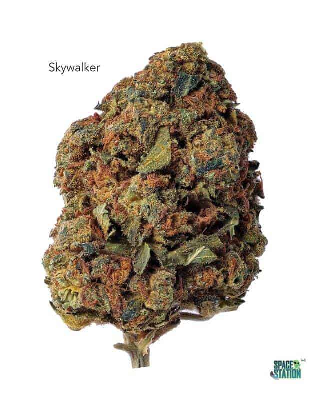 Skywalker is a popular strain across the United States, a hybrid with an even 50:50 sativa/indica ratio. Its THC levels top off at about 15 percent, making this an average to below-average strain in terms of potency. But it makes up for that with its mellow body high and mental clarity, plus a pleasing aroma and flavor. It’s a cross of Blueberry and Mazar-I-Sharif, both famous strains in their own right.