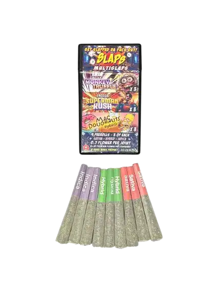 Meet the ultimate preroll experience for smokers who crave choice, convenience, and quality in every session. The SLAPS Multi-Slaps 9-Pack is thoughtfully curated with three Indica (SUPERMAN KUSH) , three Sativa (MONKEY TRUFFLE), and three Hybrid (MAC DOUGHNUTS) prerolls, giving you the perfect lineup for any mood, any moment, and any vibe.