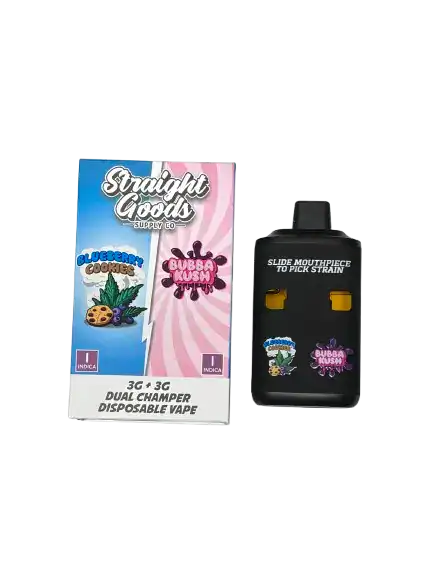 STRAIGHT GOODS 6 GRAM DUEL CHAMBER DISPOSABLE VAPE PEN – BLUEBERRY COOKIES X BUBBA KUSH