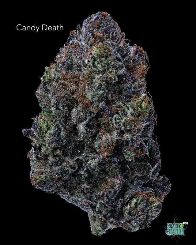 A dangerously delicious strain that blends sweet candy terps with a dark, gassy backbone, Candy Death is a bold, modern cultivar built for flavor chasers and potency lovers alike. Visually striking, the buds are dense and chunky, coated in a thick layer of frosty trichomes with rich green tones and hints of purple peeking through vibrant orange pistils.